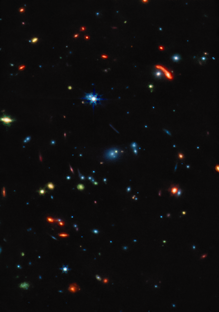 | NASA, ESA, CSA, STScI | ![]() | Las galaxias que están más alejadas, las galaxias más pequeñas que se encuentran muy por detrás del cúmulo, no se parecen en nada a las galaxias espirales y elípticas observadas en el universo local. Son mucho más grumosos e irregulares. Ampliación |