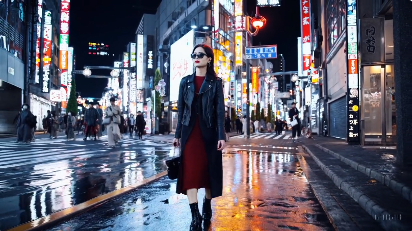 A stylish woman walks down a Tokyo street filled with warm glowing neon and animated city signage. She wears a black leather jacket, a long red dress, and black boots, and carries a black purse. She wears sunglasses and red lipstick. She walks confidently and casually. The street is damp and reflective, creating a mirror effect of the colorful lights. Many pedestrians walk about.