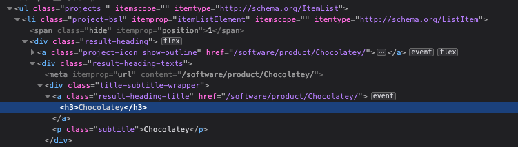 Ahora vamos a iterar en la lista para obtener cada uno de los datos que queremos. Primero, con un find en list, cada uno de los elementos de lists, el encabezado <h3>, del cual devolvemos el texto y a continuación el div que contiene el texto descriptivo.