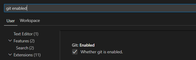 https://git-scm.com/downloads En VS Code nos aseguramos que Git esté activado, vamos a Settings, buscamos en la parte superior 'git enabled' y marcamos la casilla.
