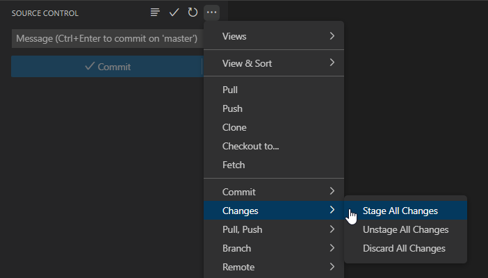 Así pues, lo siguiente es pasar los cambios al estado Staged, con el siguiente punto de menú "Changes / Stage all"
