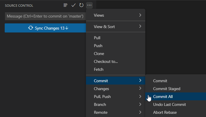 Los cambios passan a Add, marcados con una A. Luego desde el menú hacemos "Commit / Commit all"