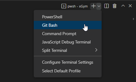 para la primera opción, procedemos a abrir un terminal con Ctrl ñ. En laparte derecha despliega los termianles y elige Git Bush, no uses CMD o PowerShell.