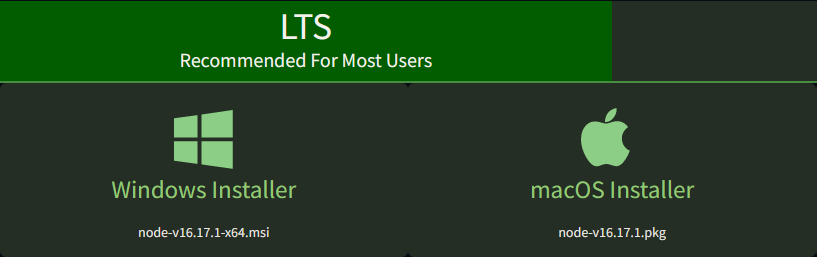 Descargar el instalador del sitio oficial de NodeJs que incluye el gestor NPM. La versión recomendada es la LTS (Long Term Support).