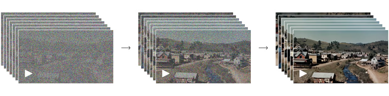 Sora es un modelo de difusión que genera un vídeo comenzando con uno que parece ruido estático y lo transforma gradualmente eliminando el ruido en muchos pasos.